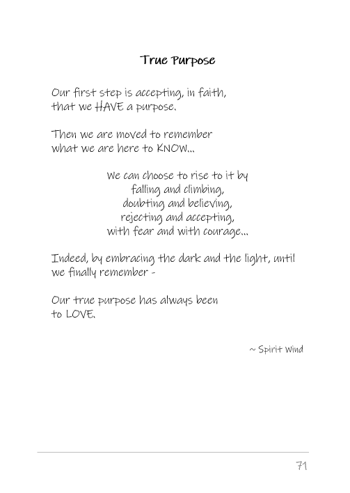 I believe this book was written by a Spiritual Wind that had moved me to go to California, giving me an adventurous spirit to search out Truth. I discovered that I wasn’t there to make a movie, not yet, for there was a far greater purpose. One of the poems defined the essence of what I found to be true for me. It’s called “True Purpose” through which I realized we make everything so complicated in this world, we get confused and sidetracked, and we try to figure it all out based on things that are unreliable. We forget that the mysterious ways of the Universe are at work for us, and that we can trust our own heart to awaken.